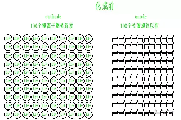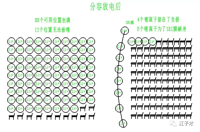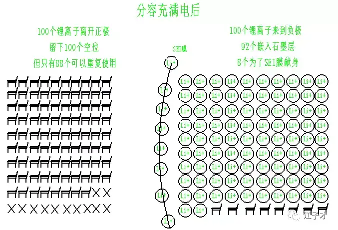 经过上面流程我们发现,原本100个正极活性锂离子在经历首次充放电之后,只有88个可以继续循环使用。损失掉12个锂离子的原因,分别为负极首效损失了8个,以及正极首效造成嵌锂空间不够、4个锂离子留在负极无法回到正极。