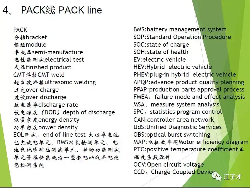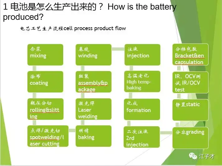 整理了一些锂电生产中常用的术语翻译版,供参考。行业中,我们称方形电池为prismatic cell,圆柱电池为cylinder cell,软包电池为pouch cell。