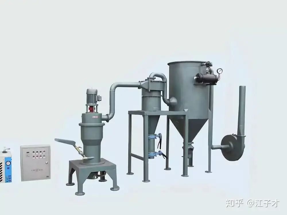 使用气流磨设备,对烧结的材料进行粉碎。气流磨工作原理:压缩空气经拉瓦尔喷咀加速成超音速气流后射入粉碎区使物料呈流态化(气流膨胀呈流态化床悬浮沸腾而互相碰撞),因此每一个颗粒具有相同的运动状态。在粉碎区,被加速的颗粒在各喷咀交汇点相互对撞粉碎。粉碎后的物料被上升气流输送至分级区,由水平布置的分级道筛选出达到粒度要求的细粉,未达到粒度要求的粗粉返回粉碎区继续粉碎。合格细粉随气流进入高效旋风分离器得到收集,含尘气体经集尘器过滤净化后排入大气。
