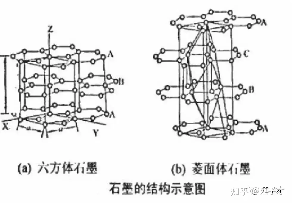 理想的石墨具有层状结构,层面由SP2的碳原子形成类似苯环的巨大平面,层平面间的碳原子以δ键相互连接,键长0.142nm,键角120°。层面之间还有个连接所有碳原子的大π键。层间为0.3354nm。两种晶型:六方晶系-2H型(a)和菱角体晶系-3R(b)Ø两种晶型可以相互转换:研磨和加热。