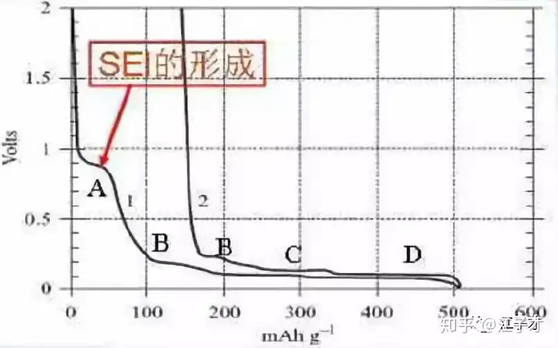 石墨理论容量372mAh/g,当然只有石墨化度非常高的材料才可以达到这个值。但是所有碳素材料在经过首次充放电时都会存在由于副反应带来的不可逆容量损失。随着负极电位的降低,直到电解液中成分在负极表面形成一种稳定的钝化膜(SEI)而停止。首次放电出现四个电压平台(如下图),其中A为SEI的形成,石墨大部分容量在0.3~0.005V范围内。除A之外,不同的电压平台对应着不同的嵌锂状态,分别称之为四阶、三阶化合物…最后形成LiC6,达到理论容量372mAh/g,晶面间距变为0.37。(来源于书本期刊,不懂勿喷!)