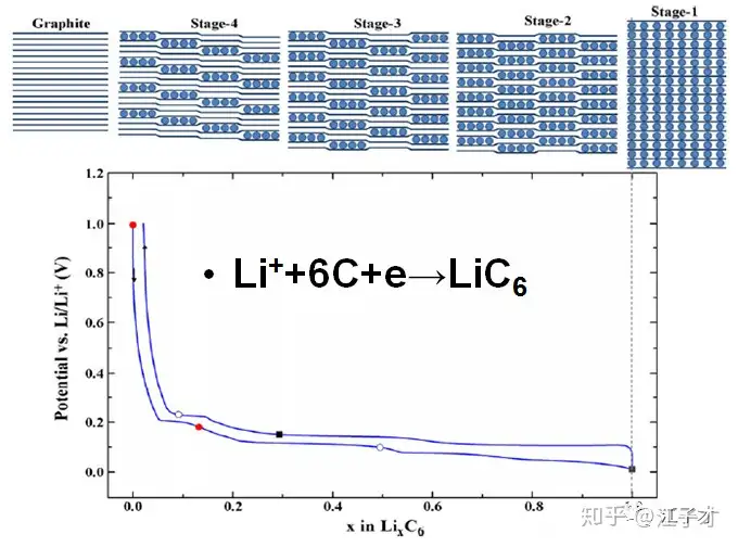 在完全插锂状态的石墨LiC6墨片排列方式发生转变(如下图):由ABABAB …转变为AAAA …排列方式。部分人造石墨较难转换排列方式,容量较低。
