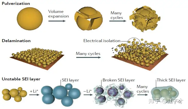 在充放电过程中,硅的脱嵌锂反应将伴随大的体积变化(>300%),造成材料结构的破坏和机械粉化,导致电极材料间及电极材料与集流体的分离,进而失去电接触,致使容量迅速衰减,循环性能恶化。由于剧烈的体积效应,硅表面的SEI膜处于破坏-重构的动态过程中,会造成持续的锂离子消耗,进一步影响循环性能。