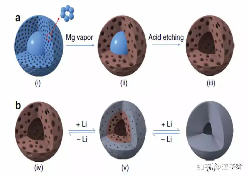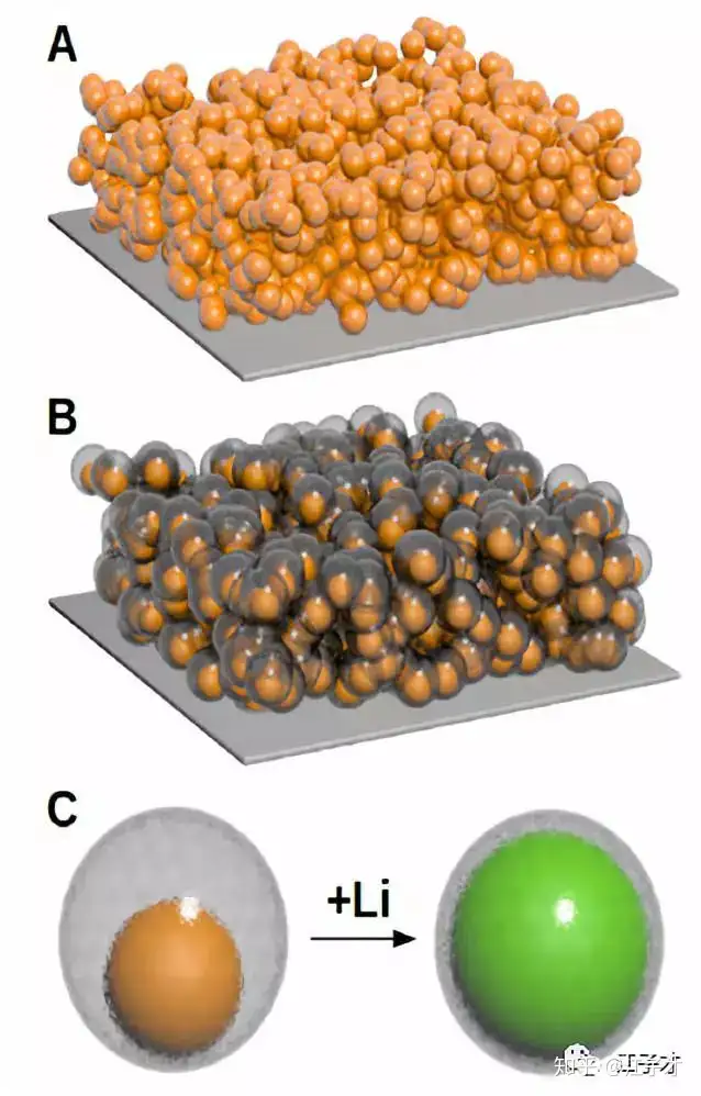 硅/碳复合材料,主要是碳包覆,如下图,虽然预留了膨胀空间,改善了循环性能,但是压实密度小,且工业化难度大。