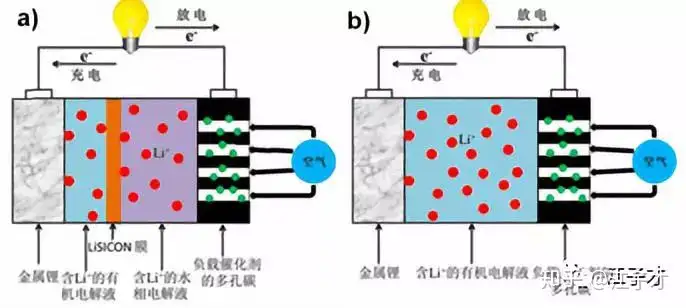 锂空气电池,结构示意图和反应方程式如下,锂空气电池具有很高的能量密度(11680wh/kg),接近燃油的能量密度,环境友好,反应生成物为水。