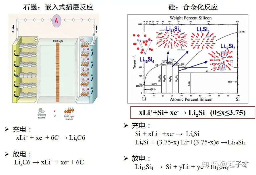 硅的充放电机理和石墨的充放电机理有所不同,石墨是锂的嵌入和脱嵌,硅则是合金化反应。