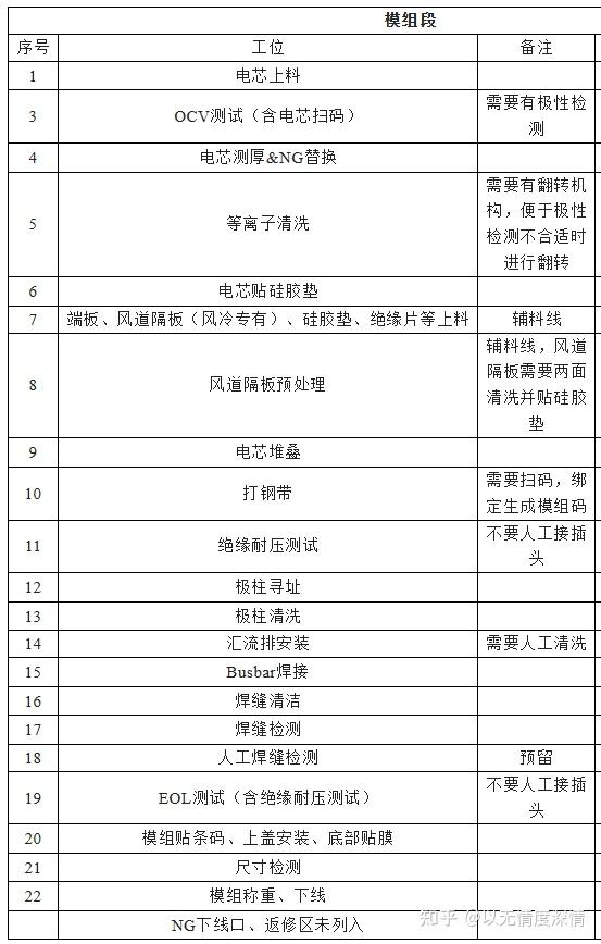 电芯上料—OCV测试及扫码—电芯贴胶及检测—电芯下线极性检测—模组成组—端板组装—模组整形挤压—锁螺丝/套钢带—打印码/贴码—焊前CCD拍照—极柱激光清洗—汇流排组件安装—汇流排激光焊接—汇流排安装夹具下线回流—焊后人工目检及除尘—人工安装线束—EOL测试—上盖安装—模组自动下线