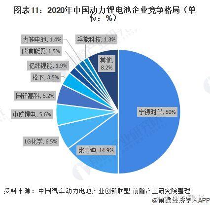 以动力锂电池企业为例,2020年1-12月,我国新能源汽车市场共计72家动力电池企业实现装车配套,较2019年同期减少3家。其中,宁德时代装车量为31.79GWh,占比50%,排名第一;比亚迪装车量为9.48GWh,占比14.9%,排名第二;LG化学装车量为4.13GWh,占比6.5%,排名第三。