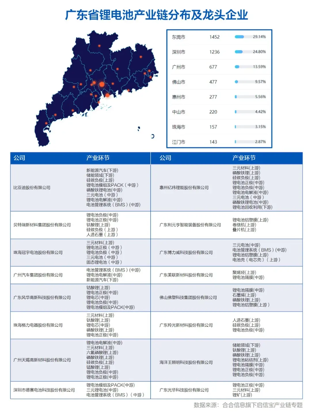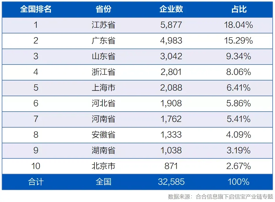 全国的锂电池产业链企业(包含上中下游)共计32585家,其中5877家位于江苏省,4983家位于广东省,分别占据了18.04%与15.29%。