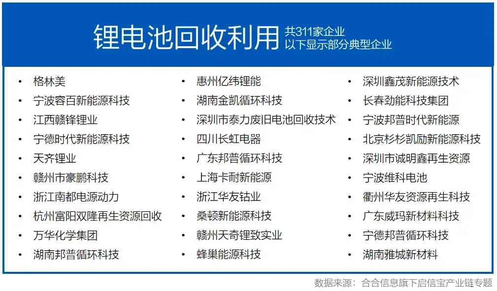 目前,参与锂电池回收的企业大多为新能源汽车制造企业、电池制造企业与第三方综合回收利用企业。
