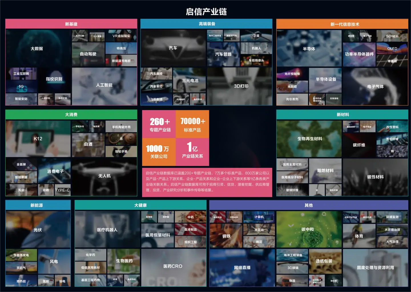 合合信息旗下启信宝基于大数据分析挖掘技术与专家行业研究,推出260+产业链专题,包含7万+标准产品,1000万家公司,涵盖新基建、新一代信息技术、高端装备、先进环保、新能源、新材料、大文娱、大消费、大健康等产业板块。