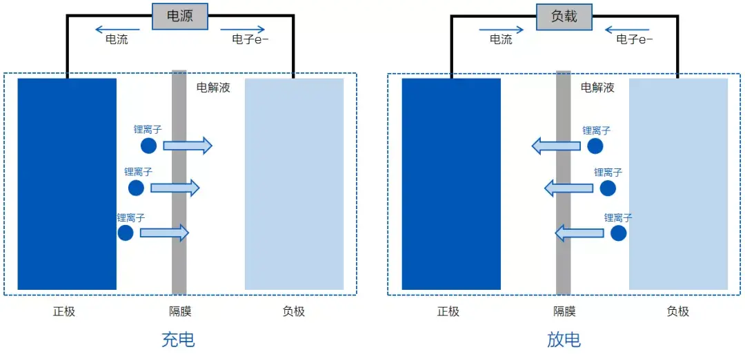 锂离子在正负极之间迁移,与正、负极材料发生化学反应,将化学能和电能相互转换,实现电荷的转移,从而完成充电与放电的过程。隔膜主要是将正极与负极隔离,防止短路。