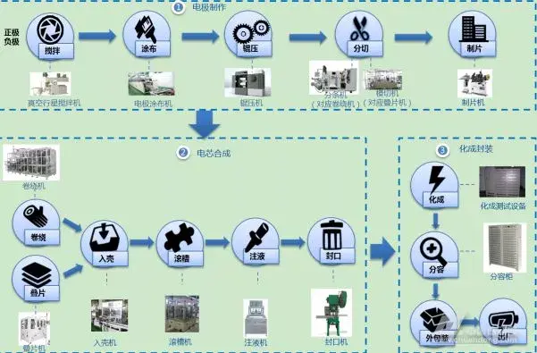 前段工序的生产目标是完成(正、负)极片的制造。前段工序主要流程有:搅拌、涂布、辊压、分切、制片、模切,所涉及的设备主要包括:搅拌机、涂布机、辊压机、分条机、制片机、模切机等。