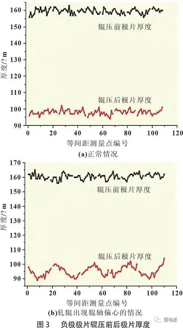 当辊压机出现问题时更要警惕,如辊压机出现轧辊偏心的情况,即由辊身和辊颈不同轴所引起的或者由轧辊本身的椭圆度所产生的实际辊缝随辊的周长周期性波动,在这种情况下,辊压后的出口极片厚度也会出现周期性变化,如图3所示为石墨为负极活性物质的极片辊压前后极片厚度变化。压实密度设定为1.35g/cm3,涂布面密度为12.36g/cm2,正常情况下厚度偏差为3μm,压实密度涨落小于0.05g/cm3,当出现轧辊偏心时,辊压后极片厚度涨落达到±7μm,压实密度涨落达到0.12g/cm3,严重影响电池一致性。