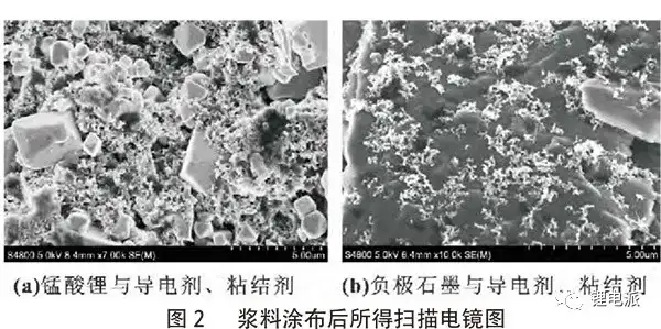 LA系列水性粘结剂是通过无皂乳液技术合成的单一共聚物的水分散液,无乳化剂、增稠剂等添加成分,体系内也不含锂离子以外的杂质阳离子,共聚物主链段为PAN。采用环保型水性粘结剂配料搅拌:根据固体含量、活性物质、导电剂与粘结剂的比例计算出各物质实际用量,然后按照去离子水、粘结剂、导电剂、活性物质的顺序分别加入,在真空条件下经过一定时间混合搅拌分散均匀,且不能有气泡产生。每次搅拌应尽量精确控制,避免过多人为因素影响电池的一致性和稳定性。例如采用锰酸锂为正极活性物质,LA133为粘结剂,superP为导电剂,按93.5∶3.5∶3(质量比)配料,固体含量定为60%,计算出各物质具体用量,在真空环境中经过8h的高速(搅拌速度为1500r/min)搅拌后得到浆料,并将黏度调整至2500~4000mPa·s,以便于涂布。图2为搅拌均匀后的浆料扫描电镜图,从图2(a)中可看到经过高速搅拌后的各物料已基本分散均匀,导电剂均匀覆盖在锰酸锂表面,图2(b)为负极石墨与导电剂、粘结剂搅拌混合后得到的导电剂均匀分布在石墨表明的扫描电镜图。为了保证锂电池一致性,应该尽量确保搅拌分散均匀,减少沉淀,并调试至合适的黏度后再进行涂布。