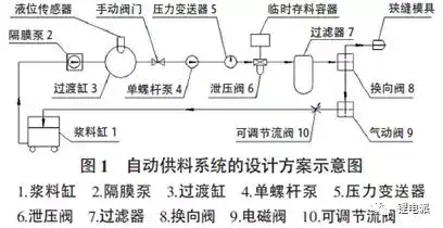 浆料上料系统是将搅拌完成后的浆料转移到储料罐后,通过隔膜泵转移到过渡缸中,然后利用螺杆泵将浆料稳定输出通过过滤装置、除铁装置输送给涂布设备进行涂布。在浆料自动上料系统中需要注意的几个点是:防止储料罐中浆料的分层、过渡缸中浆料液位、螺杆泵的稳定性、过滤罐的堵塞要及时清理等。下图是某种自动上料系统的示意图,详细见参考文献。