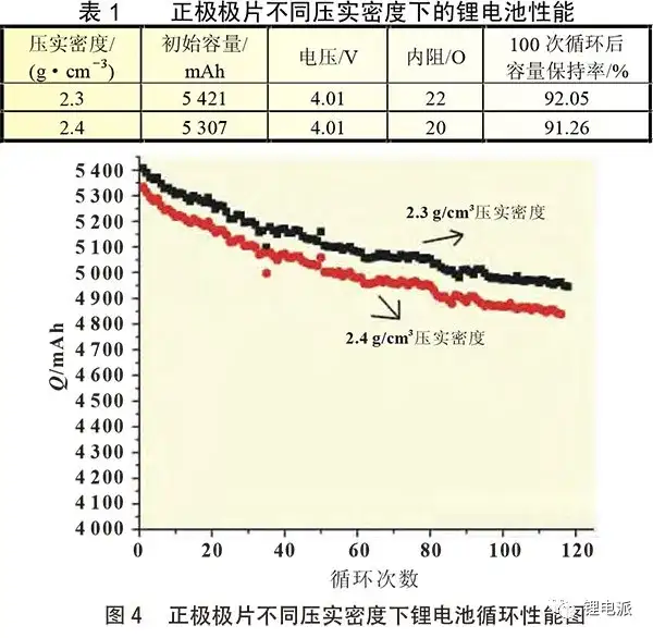 采用锰酸锂为正极活性物质,石墨为负极活性物质,LA133为水性粘结剂,如图1所示的锂离子电池生产工艺制备电池,正极极片采用不同的压实密度,分别为2.3和2.4g/cm3,负极极片采用相同的压实密度,为1.35g/cm3,制备5Ah锂电池若干个,测试其容量、电压、内阻和循环性能,并做比较,得到表1。图4为正极极片不同压实密度下锂电池循环性能曲线。可以从表1看出不同压实密度的锂电池初始容量、内阻和容量循环性能不一致,微小的压实密度差异导致了电池性能不一致,因此辊压一定要保证电池厚度均匀,以保证压实密度一致,制造出性能一致的锂电池。
