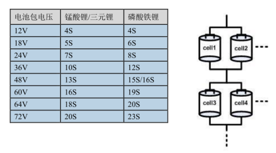 电动自行车和电动摩托车系统一般是24V、36V、48V、60V、72V系统,具体成组情况见