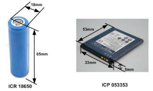 如:ICR 18650 就是直径为18mm,高度为65mm的通用的18650圆柱形电池;ICP 053353就是厚度为5mm,宽度为33mm,高度(长度)为53mm的方形电池。