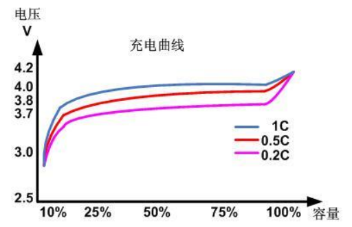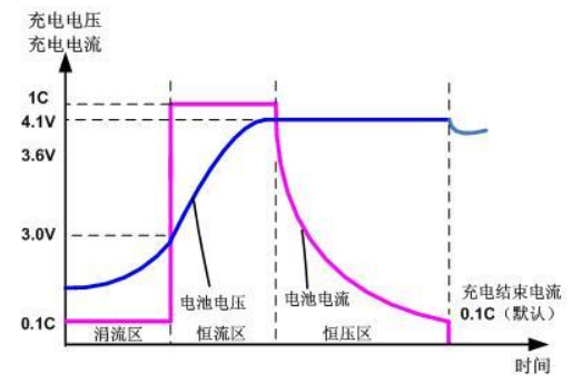 普通的钴酸锂电池,检测到电池电压低于3.0V,充电器启动涓流充电(0.1C左右),以免损坏电池,当电池电压充到3.0V后改为恒流充电(1C左右,电流大小依据系统来定),检测到电池电压到 4.1V 转换为恒压充电,当电池电流降到 0.1C 左右,充电结束,关闭充电系统和充电回路。先涓流再恒流最后恒压,充电曲线如下图所示。