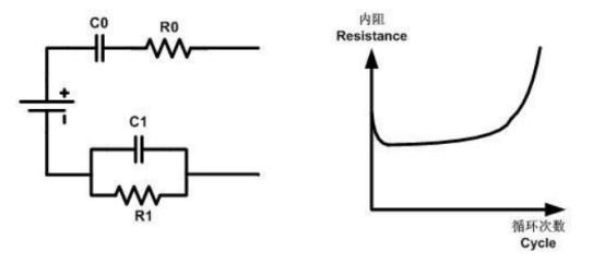 电池的内阻是反映电池的性能和寿命的一个重要参数。快到电池的循环寿命时,电池的内阻会急剧变大。如下图循环次数和内阻的关系所示: