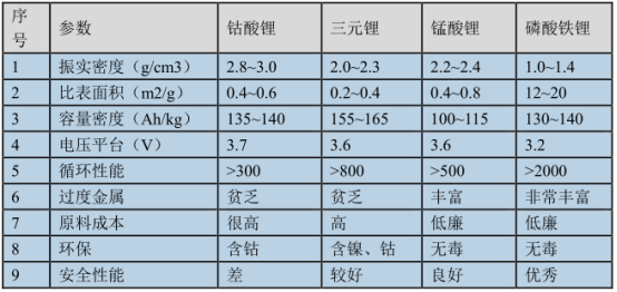 由于动力电池的特殊性,其工艺和材料的也存在一定的差异,根据正极材料的情况主要分为锰酸锂(LiMn2O4)、三元锂(LiNixCoyMnzO2)、磷酸铁锂(LiFePO4)等,其电压平台、能量密度、 价格、安全性等都有一定的差异,具体见下表的对比: