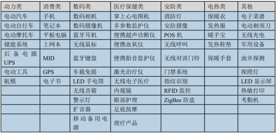 电池主要应用在消费类产品、数码类产品、动力产品、医疗和安防等。