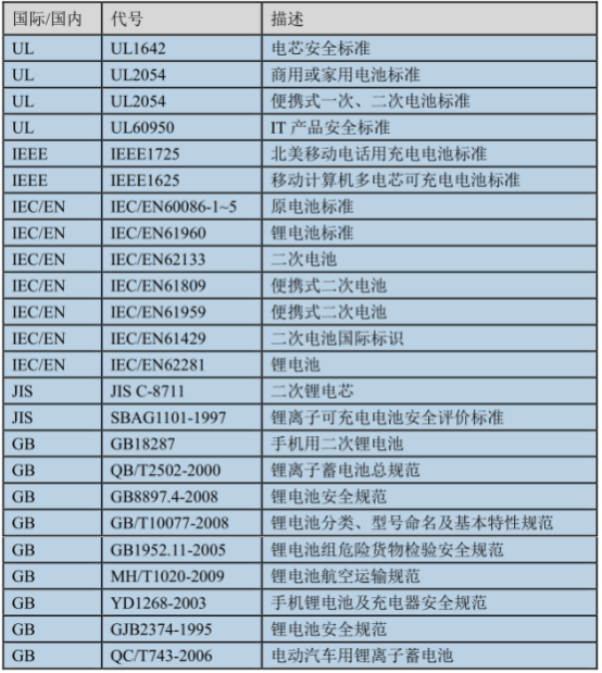 电池方面,欧洲、美国、日本、中国有不同的标准,一些相关标准整理如下: