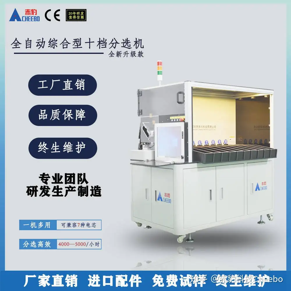 电芯自动分选机:电芯放入料仓内——测试轮运行至测试位——测试气缸动作——测试针压到电芯——测试仪读取数据——传输至电脑——电脑 进行档位匹配——电芯转至分选皮带——分选皮带运行到指定档位——档位气缸动作将电芯推出。