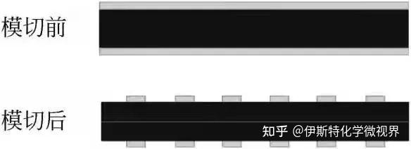 将阴阳极膜片通过成型刀模或激光剪切,制成特定形状和规格的极耳和极耳间距。图中展示了模切后的产品状态。