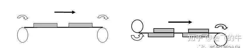 1、正极涂布即将正极浆料挤压涂或喷涂在铝集流体AB面上,单面密度≈20~40 mg/cm2(NCM功率型),涂布烤箱温度常规4-8节(或更多),每节烘烤温度95℃~120℃按实际需要调整,避免烘烤开裂出现横向裂纹和滴溶剂现象。转移涂布辊速比1.1-1.2,间隙位打薄20-30um(避免拖尾导致在极耳位压实过大,电池循环过程析锂),涂布水份≤2000-3000ppm(具体要根据材料和工艺定)。车间正极温度≤30℃,湿度≤25%。示意图如下