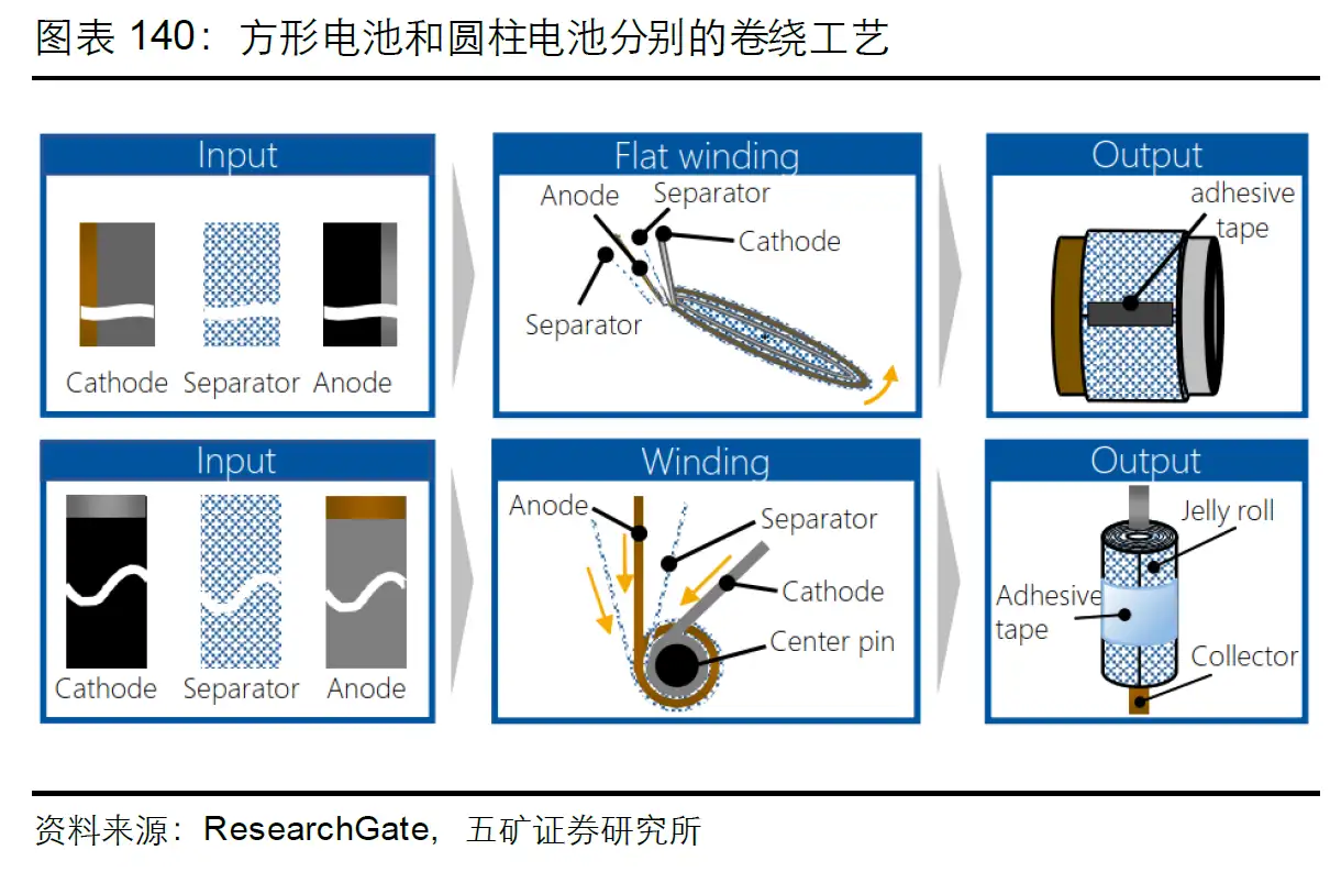 圆柱电池,圆的嘛,一看就知道只能用卷绕工艺。方形电池,方方正正浓眉大眼的,当前主流也是 卷绕工艺。