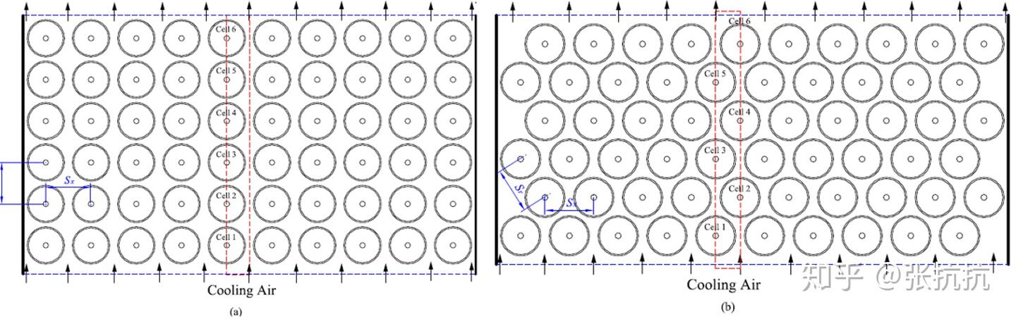 - 在相同流量的情况下,错落排列的散热情况更好,温升更低;但驱动冷却载体的能量消耗要大为增加。(个人直观理解,对齐排列只能吹侧面,而错落排放可以吹正面,所以散热效果更好,但流动阻力更大)