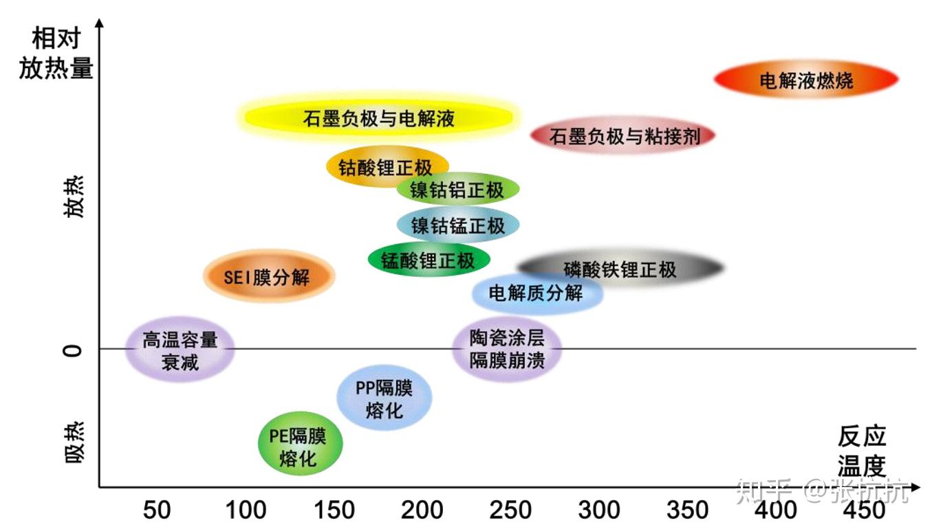 链式反应的第一个含义是指,电池的副反应通常是放热的,若散热条件不好,放热的副反应有可能引起更高温度的副反应,甚至达到450度引起电解液燃烧。下图是一个形象的表达 。