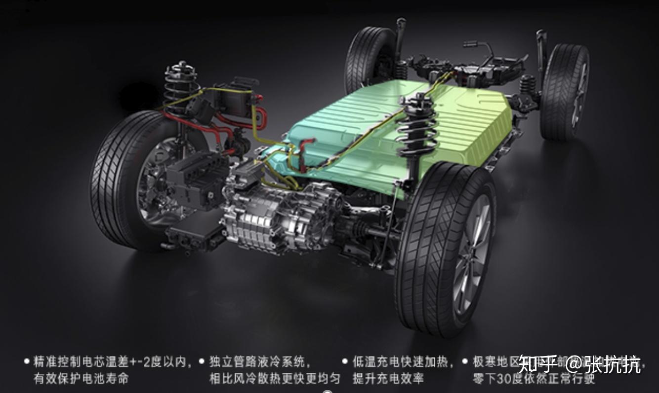 - 独立液冷回路:减小电机、DCDC系统工况对电池热管理的影响。电芯模组底部布置的铝制水冷板导热效率高、流动阻力低,实现更高的散热效率;而铝板与电芯之间覆盖导热硅脂(DIY电脑给CPU散热的就是这个东西),提高了电芯与散热板之间的导热率,提高了散热效率,也就更有利于电芯温度一致性的控制。