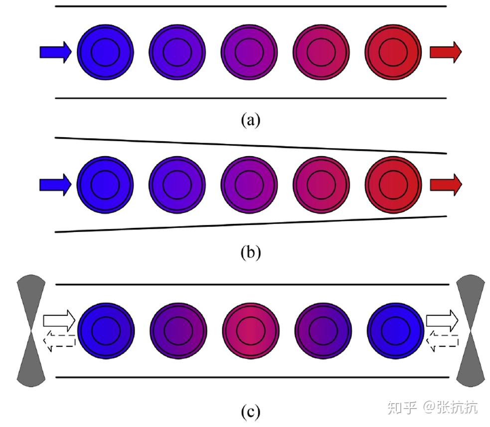 首先考虑最简单的一维设计 ,图(a)是最简单的设计,冷却载体(风冷为空气、液冷为水或冷却液)从左向右流动,这会带来一个问题:右侧的冷却液温度较高,散热效果较差,最右侧单体电池的温度就会显著高于最左侧。