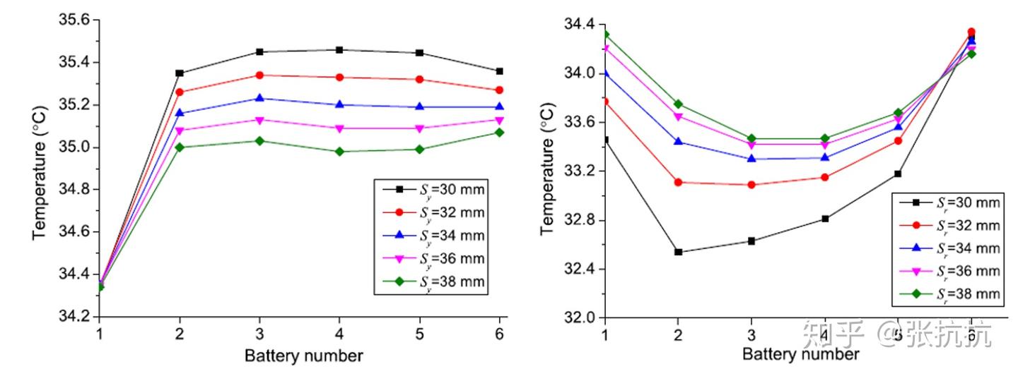 - 两种排列的温度不一致性差不多,但温度分布规律差异很大。在错落排列中,中游单体电池温升最小,上游与下游单体电池的温升都较大,这是反直觉的。