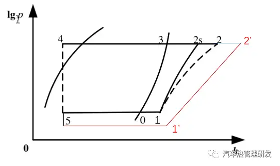 同时由于换热温差减少,对应的冷板蒸发温度可以上升,对应吸气压力可以提升,压比将减小,从压焓图上看COP从原有的(h2'-h1')/(h1'-h5)到(h2-h1)/(h1-h5),从下图可以直观看到系统的COP得到提升。感兴趣的读者可以做一些仿真就知道具体的差异。