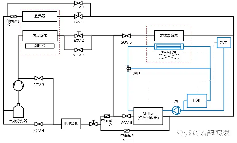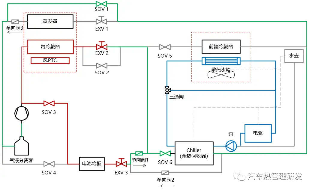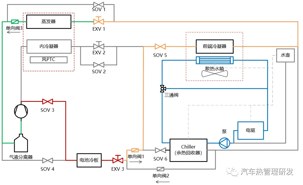 水路系统非常简单,仅仅一个水泵,基本上通过环境散热给电驱散热,冬天通过余热回收器回收电驱动的热量。从架构上看基本不会用到制冷剂给电驱动冷却。
