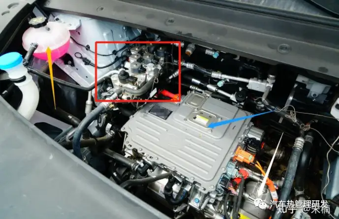 借用知乎的图片,可看到海豚的热泵系统采用了类似特斯拉集成化的阀岛方案,比亚迪对冷媒回路进行了大规模集成,采用红框所示阀岛结构把制冷剂回路大部分控制组件进行了集成。