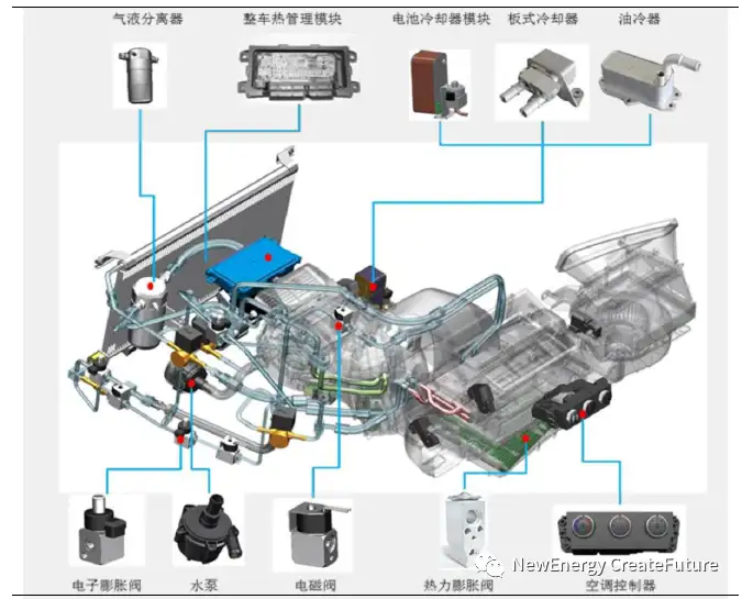 如下图所示,为新能源热管理系统主要零部件及其构成: