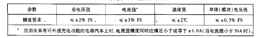 BMS应能检测电池电和热相关的数据,至少应包括电池单体或者电池模块的电压、电池组回路电流和电池包内部温度等参数。且所检测状态参数的测量精度要求如下表所示
