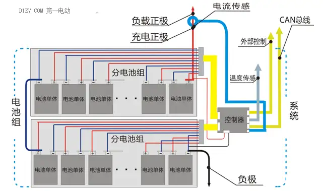 通过对其定义的解释,我们可以通俗的理解为BMS由主控和从控组成。主控负责控制以及与其他控制单元的信息交互,从控则负责数据采集。