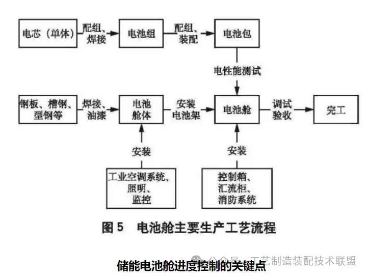 图4是电池舱内部,电池舱整体装配完成后,进行最终电性能测试及品质检测,单个电池箱完工后由公路运输发货至现场。图5是电池舱主要生产工艺流程。
