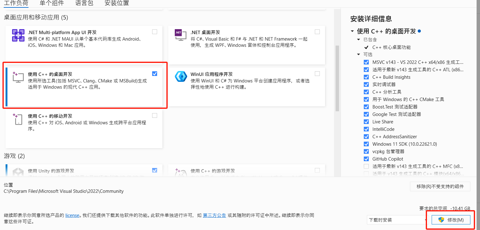 添加C++桌面开发环境