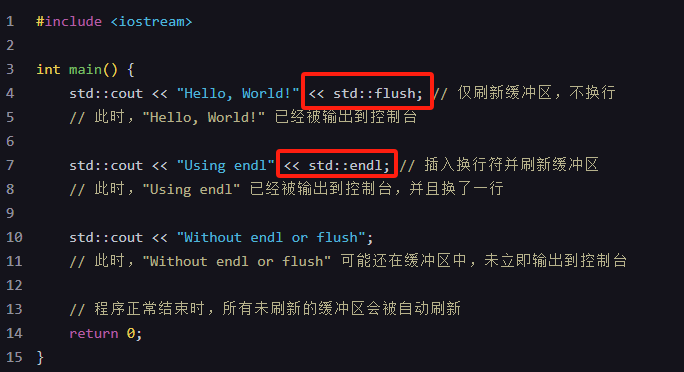 可以使用 std::endl 操纵符来插入换行符并同时刷新缓冲区。