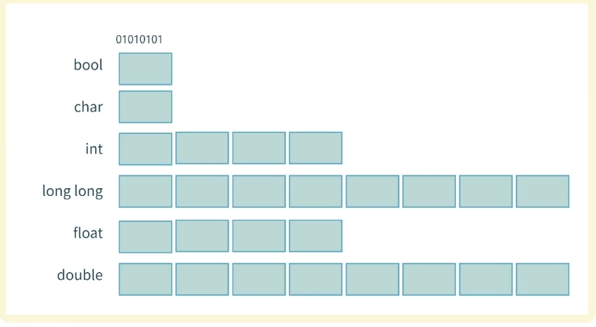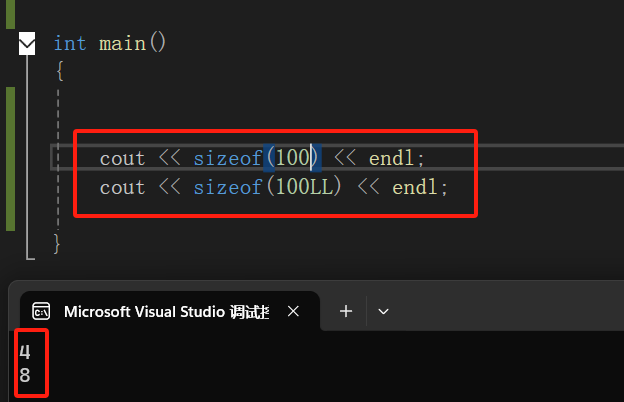 比如long long 类型的字面量就按如下的方法,可以用字节数看出两者的不同