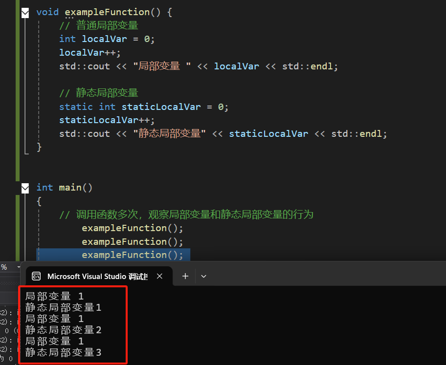 静态局部变量在程序的整个生命周期内只被初始化一次(首次进入函数时)。