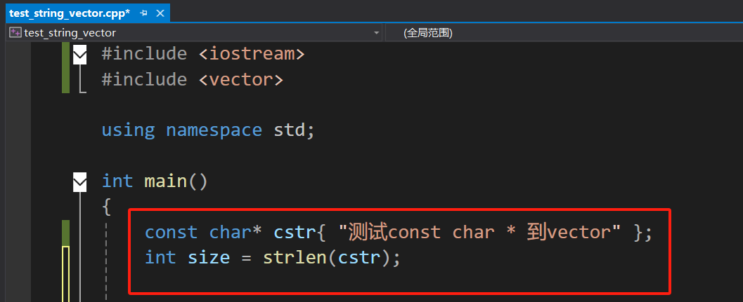 const char*类型的字符串指针cstr,指向字符串"测试const char * 到vector"。