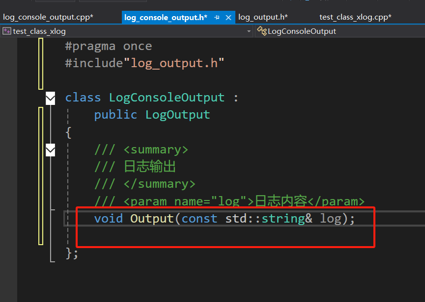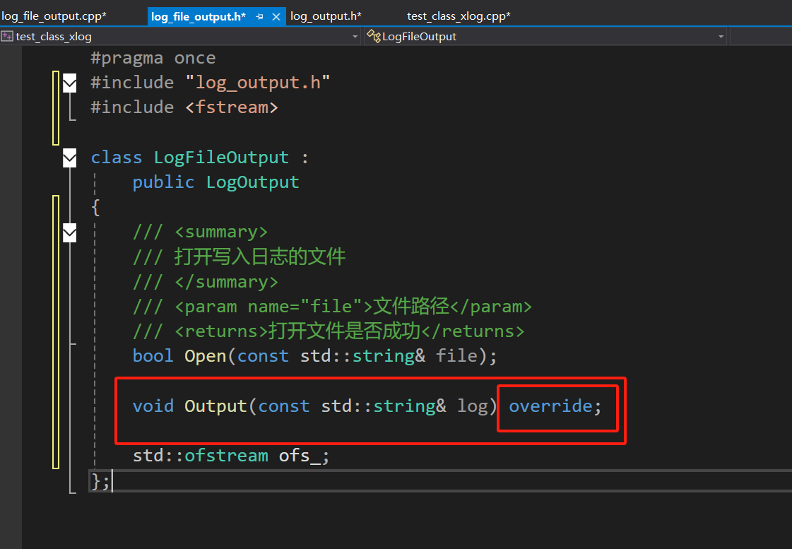 继承父类虚函数并进行声明,因为在前面已经声明并实现了Output函数,所以我们要重写该函数
